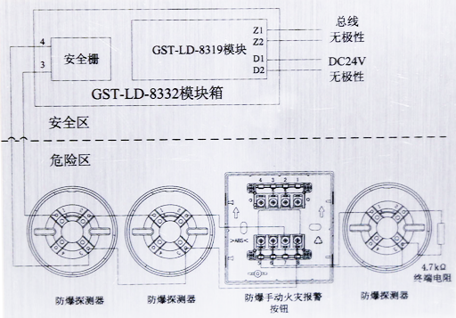 GST-LD-8332編址接口模塊(以下簡稱編址接口模塊)可與防爆設(shè)備(防爆感溫、感煙、煙溫復(fù)合探測器、防爆手動報(bào)警按鈕等)配接,組成本安型防爆系統(tǒng)。一旦發(fā)生火災(zāi),編址接口模塊將報(bào)警信號通過總線傳入火災(zāi)報(bào)警控制器(以下簡稱控制器),控制器產(chǎn)生報(bào)警信號并顯示出編址接口模塊的報(bào)警地址信息。當(dāng)編址接口模塊本身出現(xiàn)故障時(shí),控制器將產(chǎn)生故障信號并顯示編址接口模塊故障地址信息。