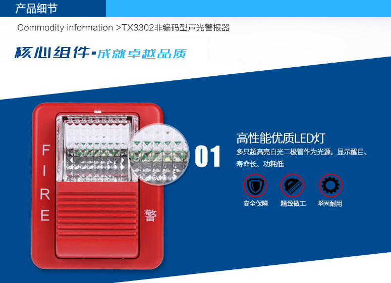 TX3302聲光警報(bào)器(以下簡(jiǎn)稱聲光警報(bào)器),是一種安裝在現(xiàn)場(chǎng)的聲光報(bào)警設(shè)備。采用高亮度的LED光源,聲光警報(bào)器啟動(dòng)后發(fā)出強(qiáng)烈的聲光報(bào)警信號(hào),以達(dá)到提醒現(xiàn)場(chǎng)人員注意的目的。