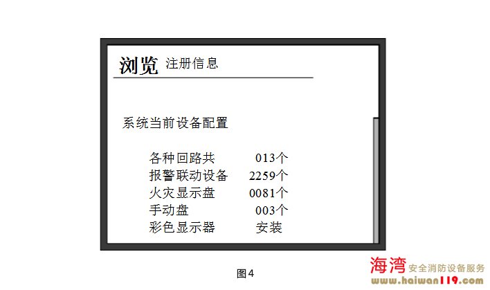 完成以上操作后,系統(tǒng)上電進行初始化(畫面顯示如圖1所示)。初始化完成后進入對運行記錄、隔離信息、聯(lián)動公式、聲光電源的自動檢查狀態(tài)(畫面顯示如圖2所示),自檢完畢,控制器對外接火災(zāi)顯示盤、探測器和模塊進行注冊(如圖3所示),并顯示注冊信息 (如圖4所示) 。至此,開機過程結(jié)束,系統(tǒng)進入正常監(jiān)控狀態(tài)。主機鍵盤上設(shè)有“自檢”鍵,按下此鍵后系統(tǒng)將進行和開機時相同的聲光及電源檢查。 關(guān)機過程按照與開機時相反的順序關(guān)掉各開關(guān)即可。要注意各個備電開關(guān)一定要關(guān)掉,否則,將有損壞電池的可能。