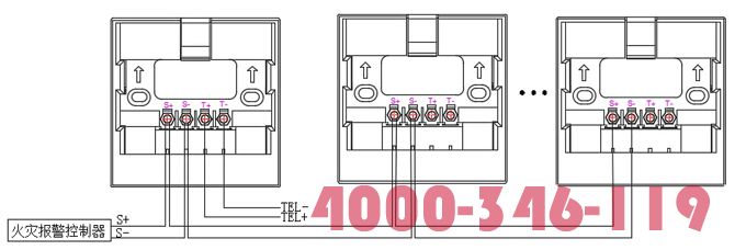 “S+”、“S-”為總線端子,接入火災(zāi)報(bào)警控制器;“T+”、“T-”為對(duì)講電話接線端子,可根據(jù)需要接入消防電話主機(jī)。